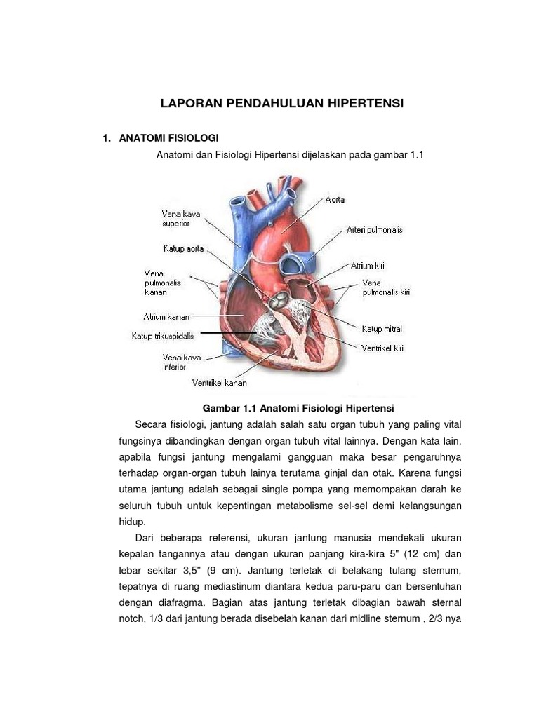 Lantaran hipertensi ada hubungannya dengan kerja jantung maka dalam artikel ini bakal di sajikan anatomi serta fisiologi jantung. Hipertensi sistolodiastolik didiagnosis bila tekanan darah sistolik TDS 140 mmHg dan tekanan darah diastolik TDD 90 mmHg. Menurut laporan dari Puskesmas Kambang penderita hipertensi meningkat setiap tahunnya dan menjadi salah satu sepuluh penyakit terbanyak tahun 2017 berada pada urutan ke-4empat.